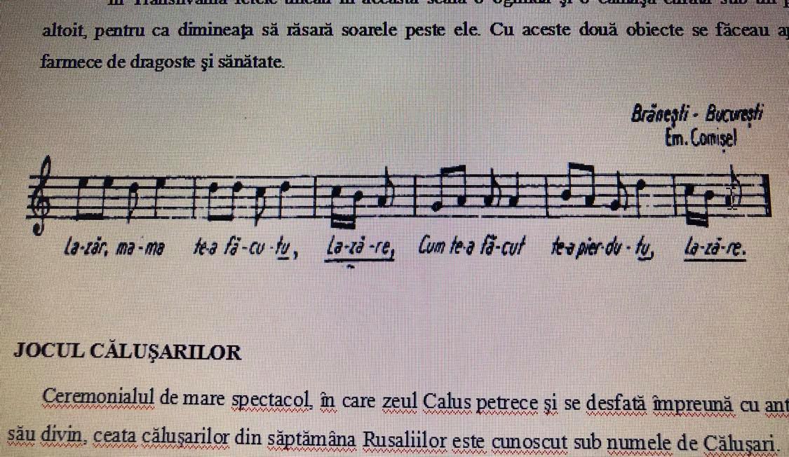 - jucatul copiilor purtaţi în braţe în hora Căluşului sau săritul lor, întinşi pe pământ, de către căluşari pentru alungarea bolilor, în special a "frigurilor";